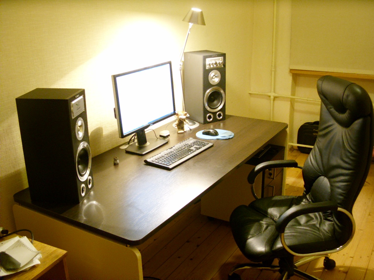 Ну, в качестве системника у меня ноутбук, поэтому есть только фотка рабочего места :) Колонки только я развернул в разные стороны — хоть и выглядит странно, но отражённый звук приятнее, объёмнее что-ли, чем прямой (как на фото).