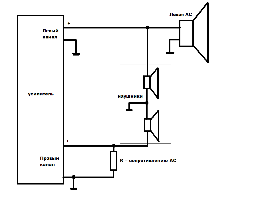 Земляной провод наушников висит в воздухе, поэтому получаете удвоенное сопротивление нагрузки в диагонали (например, 600 Ом в случае с 650-ми сенхами :wink: ). К АС подключаться прямо на ее клемму "+", после акустического кабеля от усилителя.