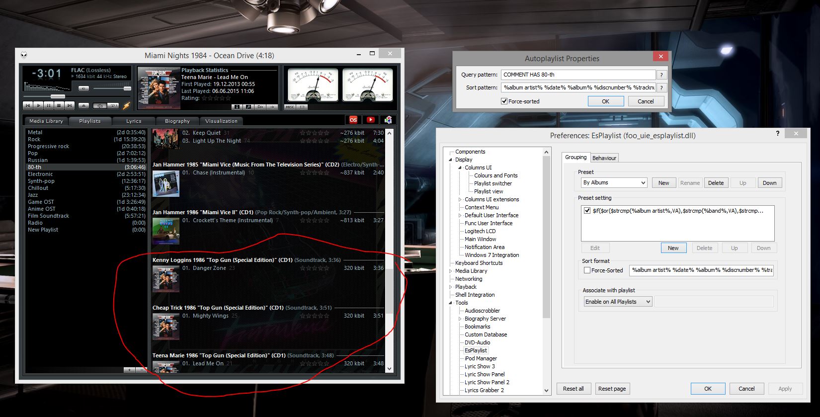 В старой сборке я в свойствах авто-плей-листа прописывал параметры sort pattern и всё было замечательно и выводило именно так, как мне надо. Но в сборке от Алекса данный вариант не работает. Однако есть вариант настройки собственно плей-листа в меню настройки плагина (esplaylist).