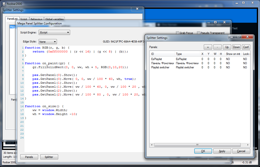 Нижняя (foo_uie_mega_panel_splitter), там скрипт отображения панелей. Тут задаются координаты и само движение.