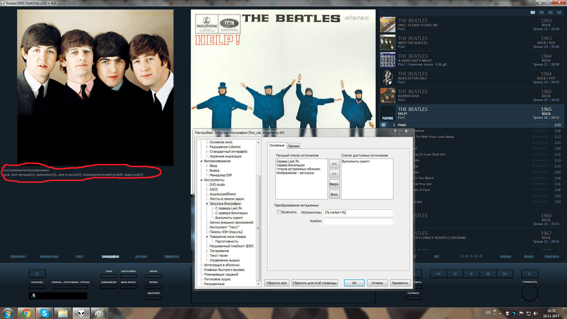 Нашел 1 вариант через скрипт lastfm_bio.vbs .Сделал все по инструкции и все заработало :smile: .Вот только хотелось бы на русском чтобы биографию грузило.Почитал в комментариях что нужно просто выбрать русский сервер и если биографию выдаст на английском то на русском ее просто нету.Во вкладке "Загрузка биографии>С сервера Last.fm" стоит русский сервер но биографию показывает всё равно на английском.Нашел еще какой-то скрипт от marc2003,говорят работает хорошо.Вот теперь сижу думаю может по первому варианту как-то получится настроить или делать все по скрипту от marc2003