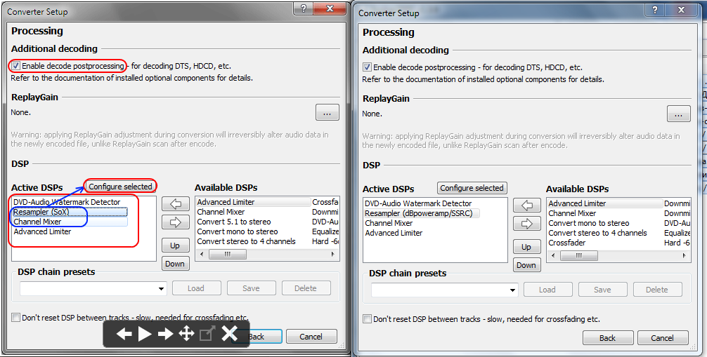 Однако вижу разницу в настройках. Хотя скачал и поставил plug-in SoX Resampler - я вижу в списке Avaiable DSP Resampler (dBpoweramp/SSRCS) и еще Resampler (PPHS). Resampler (SoX) в исписке имеющихся отсутствует. Слева - иллюстрация из инструкции, справа - как у меня.