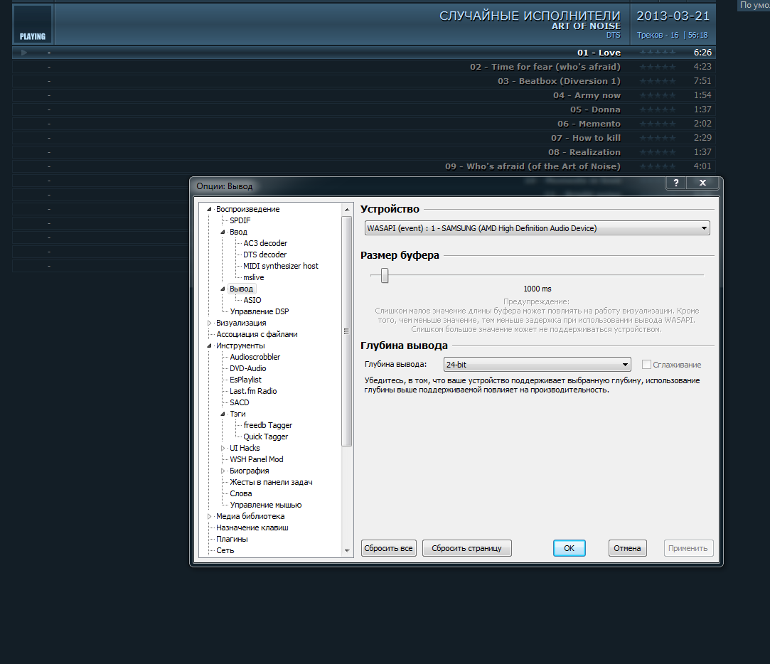 Если же эти файлы проигрывать через DaumPot Player,на дисплее ресивера показывает DTS 96/24 или DTS.Если в настройках вывода звука в Foobar2000 выставить DS-Samsung(AMD High Definitiob Audio Divice),звук резко падает,и показывает только 2 канала.Как мне вывести звук без обработки(bitstrem),как и через PotPlayer?Windows 7 x64
