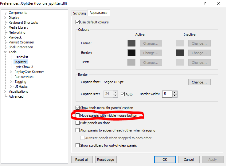 1. Панели добавляются в сплиттер в произвольном порядке, где с ними можно работать как с обычными окнами Windows, а именно: перемещать, изменять их размер, сворачивать, разворачивать, закрывать. Т.е. при работе с плагином foobar2000 превращается в приложение с MDI интерфейсом (Multi Document Interface). Для точного позиционирования панелей предусмотрено отображение координат и их редактирование "на лету" в заголовке окна панели (полезно при дизайне интерфейса сборки). Также имеется возможность настраивать цвета и шрифт заголовка окон панелей.
