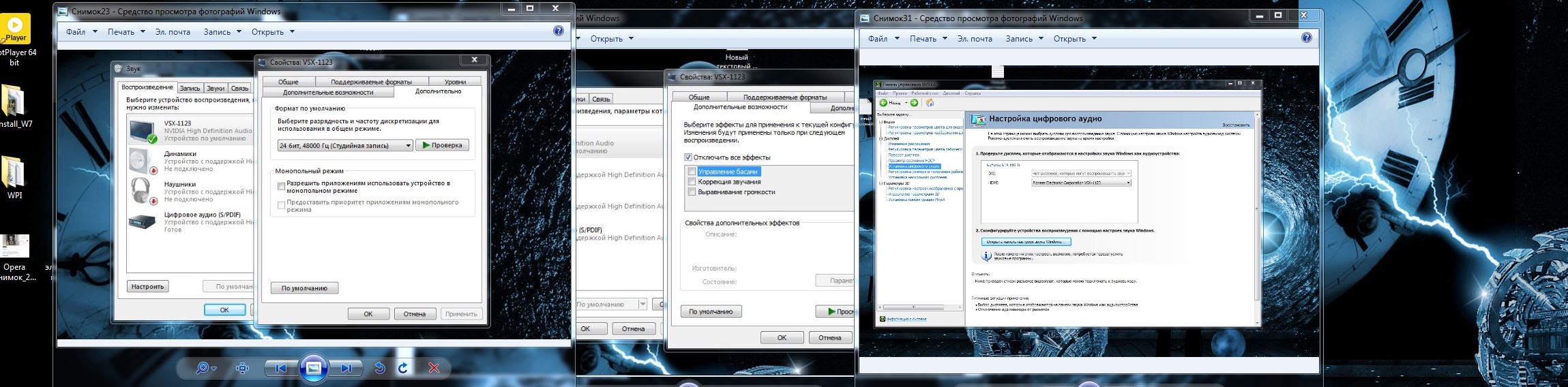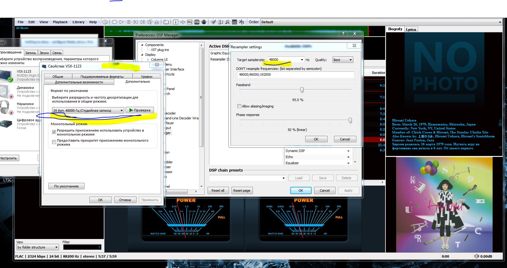 Ага, со скринами уже понятней. Вот смотри... при выводе по wasapi то, что у тебя подчёркнуто (24/48000) роли совершенно не играет, т.к. ниже стоят галочки на монопольном режиме. При нормальных настройках даже если там 16/44100, на ресивер спокойно пройдёт стерео 24/192000. В монопольном режиме эта часть микшера обойдётся стороной. Смотрим на скрине правей... очень грубая ошибка что не поставлена галочка на отключение эффектов. С тембром, подгоняя под комнату звучание, работай только на ресивере.
