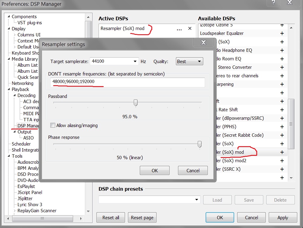 Добавьте ресемплер в активные DSP и настройте его на ресемплинг в какую-нибудь поддерживаемую частоту.