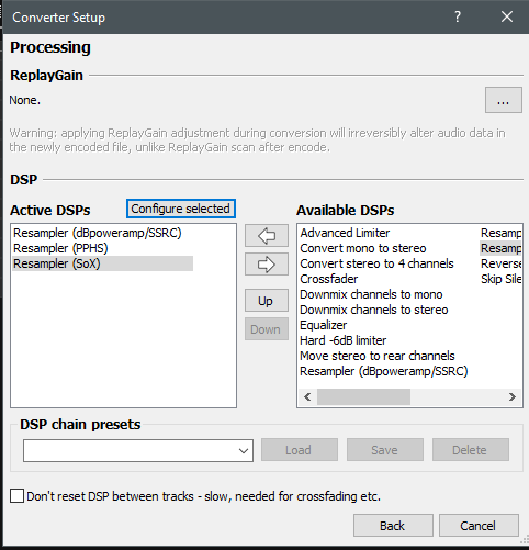 При ресемплинге, кстати, есть ещё один нюанс - возможность получить слышимые щелчки между треками, если использовать не SoX (foo_dsp_resampler) версии выше 0.8.3 и не SRC версии выше 1.0.1, при этом не используя опцию "Don't reset DSP between tracks"