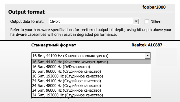 ) В этом случае для вывода звука из фубара не имеет значения, что выставлено в диспетчере реалтек. А вообще, в диспетчере выставить 24/44100 или 24/48000.Azaza:В фубаре - 24 бита.