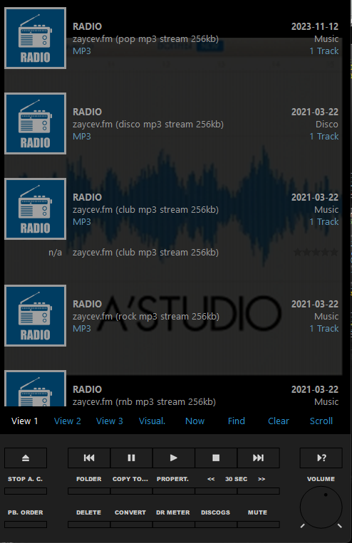 - Control Panel [средней кнопкой мыши на кнопке "OPEN" - вкл./выкл. автопереключение VU Meters в группе "Control Panel"; колесом на кнопке "OPEN" - пред./след. VU Meter в группе "Control Panel"; средней кнопкой мыши на кнопках управления воспроизведением - переключит цвет этих (и названия других) кнопок; средней кнопкой мыши на кнопке "Stop A. C." - переключит цвет названия кнопки (когда функция включена); средней кнопкой мыши на кнопке "PB. Order" - переключит её на две маленькие (пред./след.); средней кнопкой мыши на одной из дополнительных кнопок - переключит их на другие кнопки (функции)];