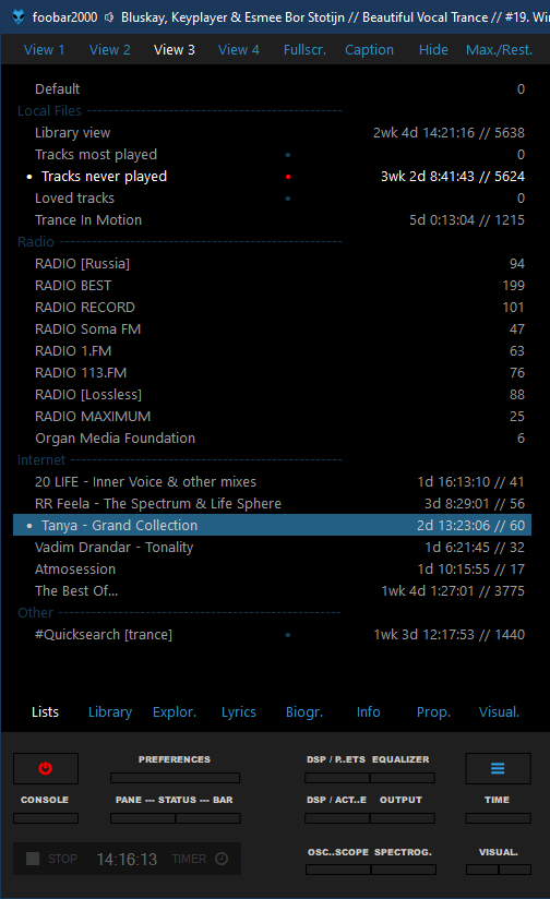 - В панели "Lists" можно выбрать различные виды отображения. Для выбора желаемого вида нужно зайти в настройки "Preferences\Display\Columns UI\Playlist switcher -> Use title formatting for playlist titles:" и поменять значения view, lock, data и separator.