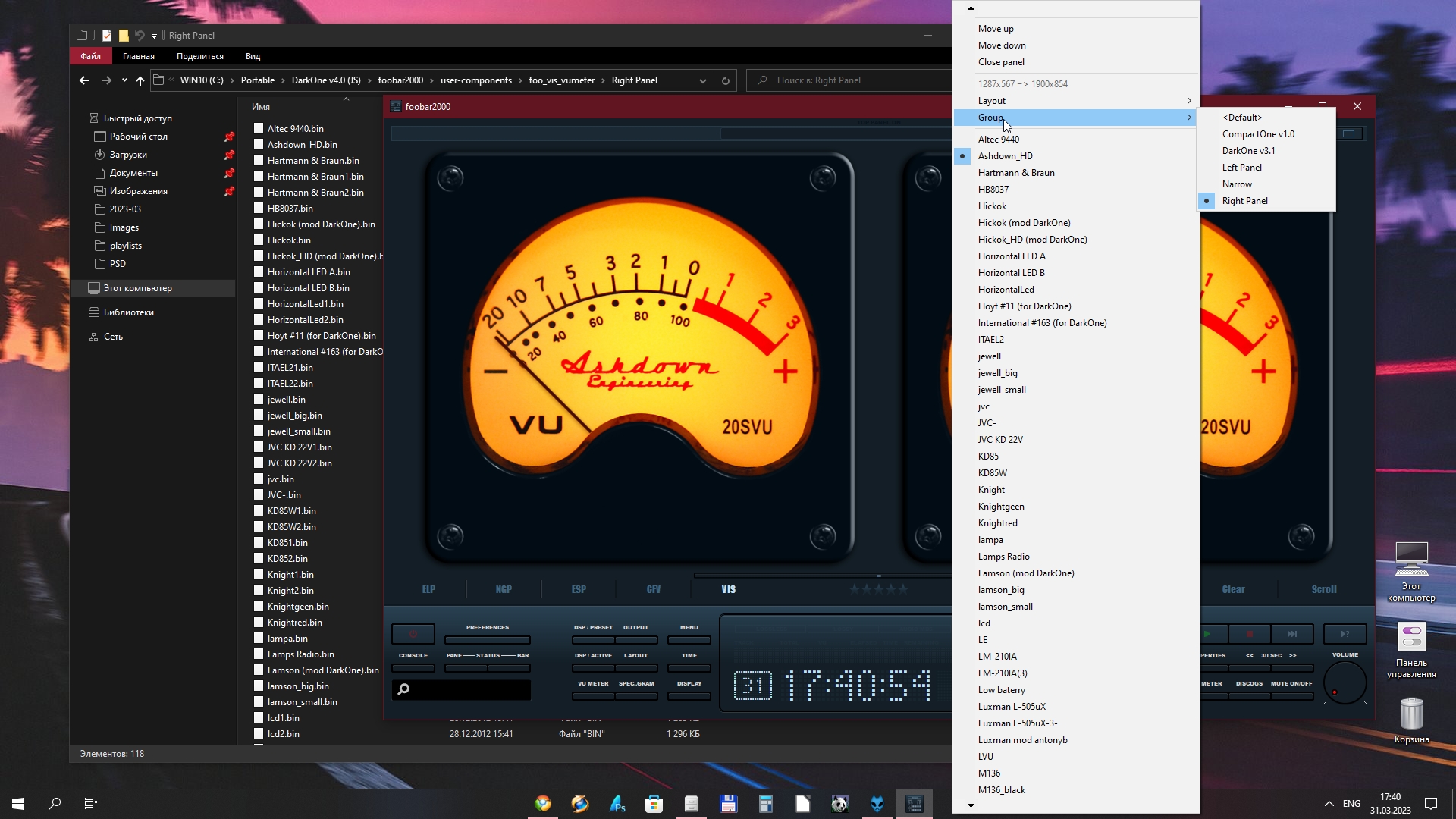 огромное спасибо, но увы. всё так же в вертикальном сплиттере нет analog VU meter. и как его добавить не знаю. импорт вашего файла настройки ни чего не добавил.больше мучать не буду . пользуюсь (smp) или надо создовать кучу папок и делить VU и расклаыват по разным папкам. тогда можно пользоваться всеми VU. буду ковырять дальше. спасибо за помощь. такое ощёщение что плеер не видит какую то настройку или библиотеку или ещё чего.
