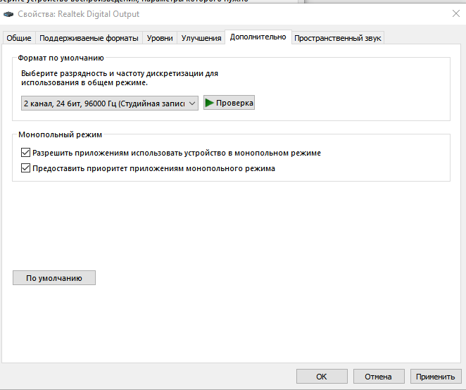 Vasia215, если и так ничего не получится, то легко можно попробовать плагин foo_spdifer (он работает на вин 7-8-10). После инсталляции его настройки появятся в настройках звука, но думаю, что у тебя всё будет путём после выбора устр-ва по умолчанию, в фубаре тоже его выбери. У тебя это будет "wasapi event Реалтек диджитал выход".