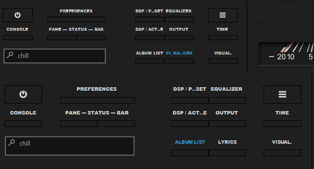 - Control Panel [средней кнопкой мыши на кнопке "OPEN" - вкл./выкл. автопереключение VU Meters в группе "Control Panel"; колесом на кнопке "OPEN" - пред./след. VU Meter в группе "Control Panel"; средней кнопкой мыши на кнопках управления воспроизведением - переключит цвет этих (и названия других) кнопок; средней кнопкой мыши на кнопке "Stop A. C." - переключит цвет названия кнопки (когда функция включена); средней кнопкой мыши на кнопке "PB. Order" - переключит её на две маленькие (пред./след.); средней кнопкой мыши на одной из дополнительных кнопок - переключит их на другие кнопки (функции)];