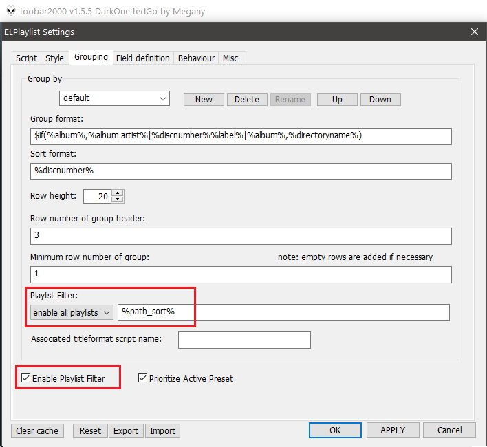 2. Для отображения обложек в панели Album Browser (панель EsPlaylist) необходимо зайти в Preferences - Tools - EsPlaylist, выделить поле %album artist% и нажав кнопку Edit убедится, что в графе Artwork установлен нужный тип обложки, которая будет отображаться для отрисовки сортировки по исполнителю. Возможен выбор из None, cover font, cover back, disc, artist, icon. Сама настройка поиска этих изображений находится в Preferences -> Display в соответствующих вкладках. Затем эти же действия повторить для %date% %album% %discnumber%. После всех изменений ПКМ по EsPlaylist -> Options -> Refresh.