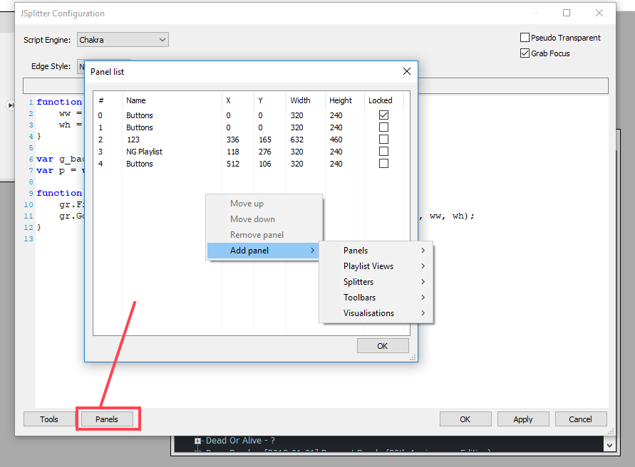 либо окна редактирования скрипта (см. скриншот). Список панелей можно также использовать для добавления, удаления, переупорядочивания панелей, а также изменения их положения и размеров вручную (двойной щелчок по соответствующему полю):