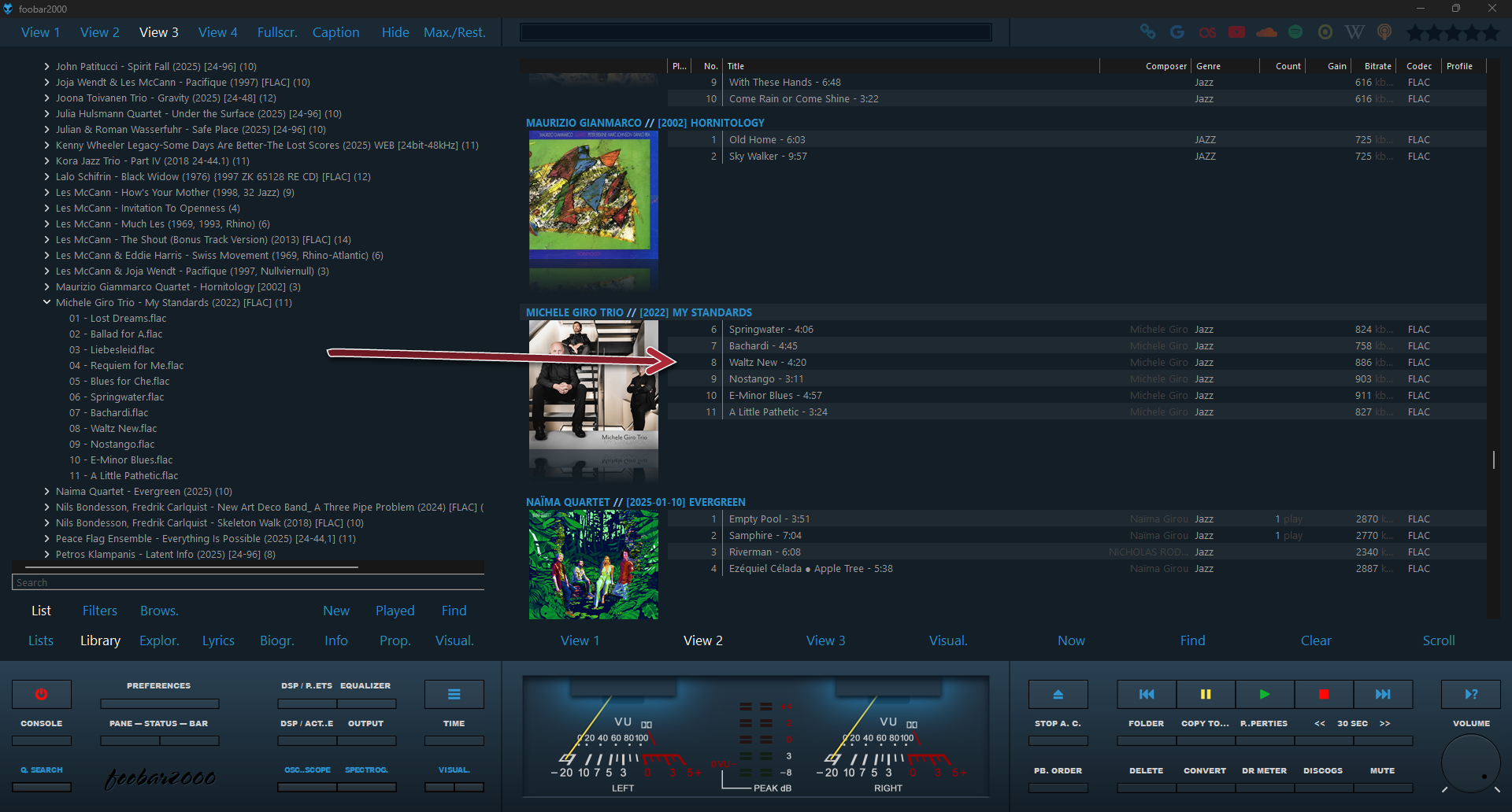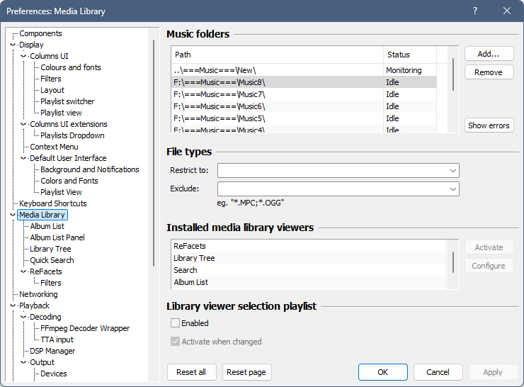 - В панели "Lists" можно выбрать различные виды отображения. Для выбора желаемого вида нужно зайти в настройки "Preferences\Display\Columns UI\Playlist switcher -> Use title formatting for playlist titles:" и поменять значения view, lock, data и separator.