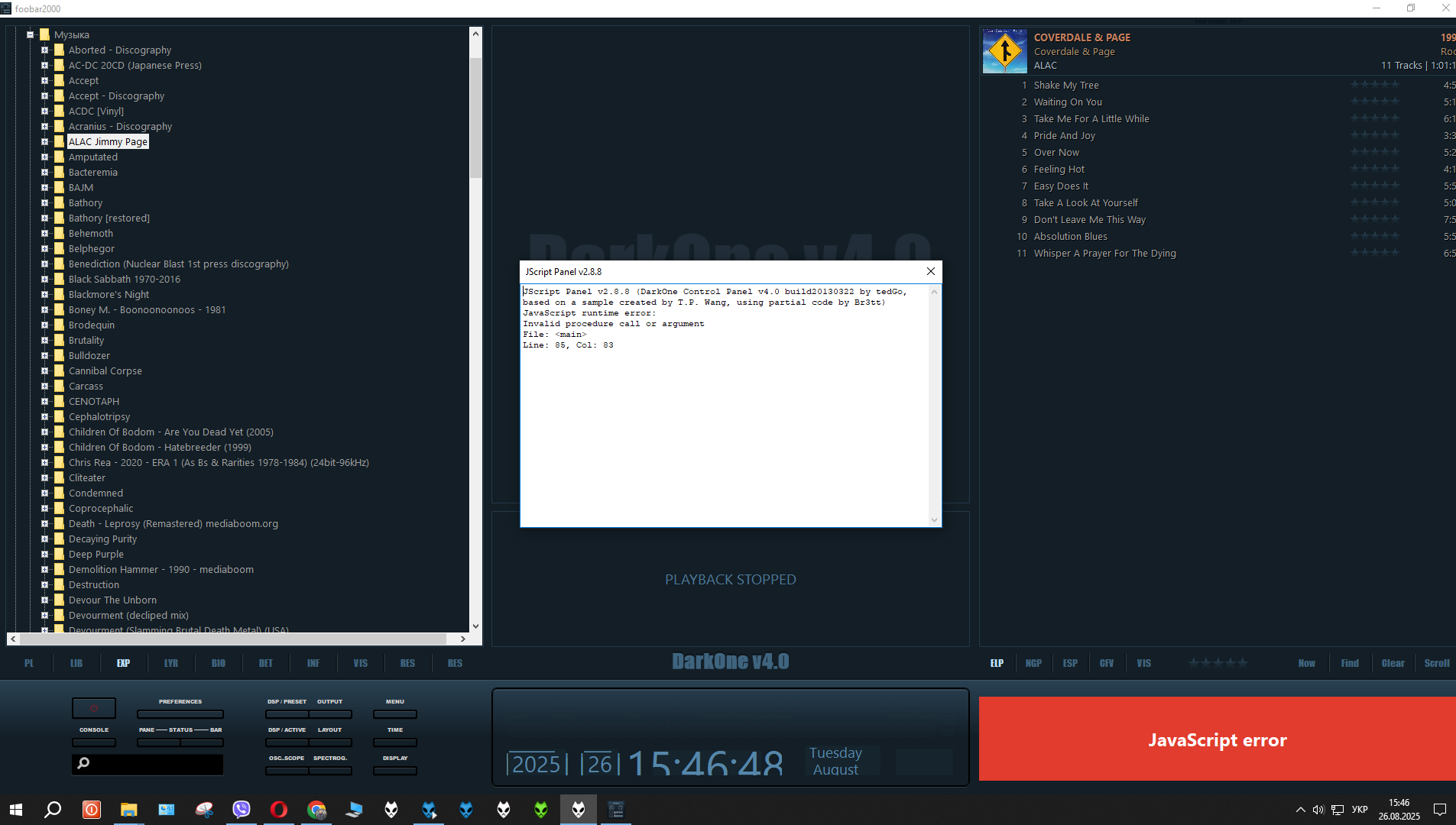 kutuzof, Привет. Запустил сборку от АНАРХІСТ 25.08.2025. DarkOne v4.0 (JS) - собрана на JScript Panel v2.8.8 (foobar2000 v1.5.12) выдает ошибку.