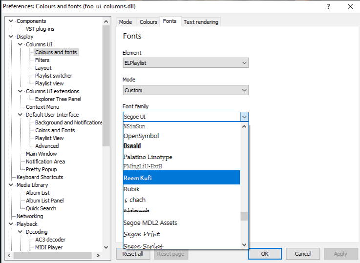 11. Размер шрифта в Columns UI можно изменить (из-за несовместимости с компонентом "UI Hacks") только обходным путём, временно отключив компонент "foo_ui_hacks". Переименуйте папку компонента "foo_ui_hacks" в "_foo_ui_hacks", измените размер шрифта на нужный, затем снова измените имя папки на "foo_ui_hacks".
