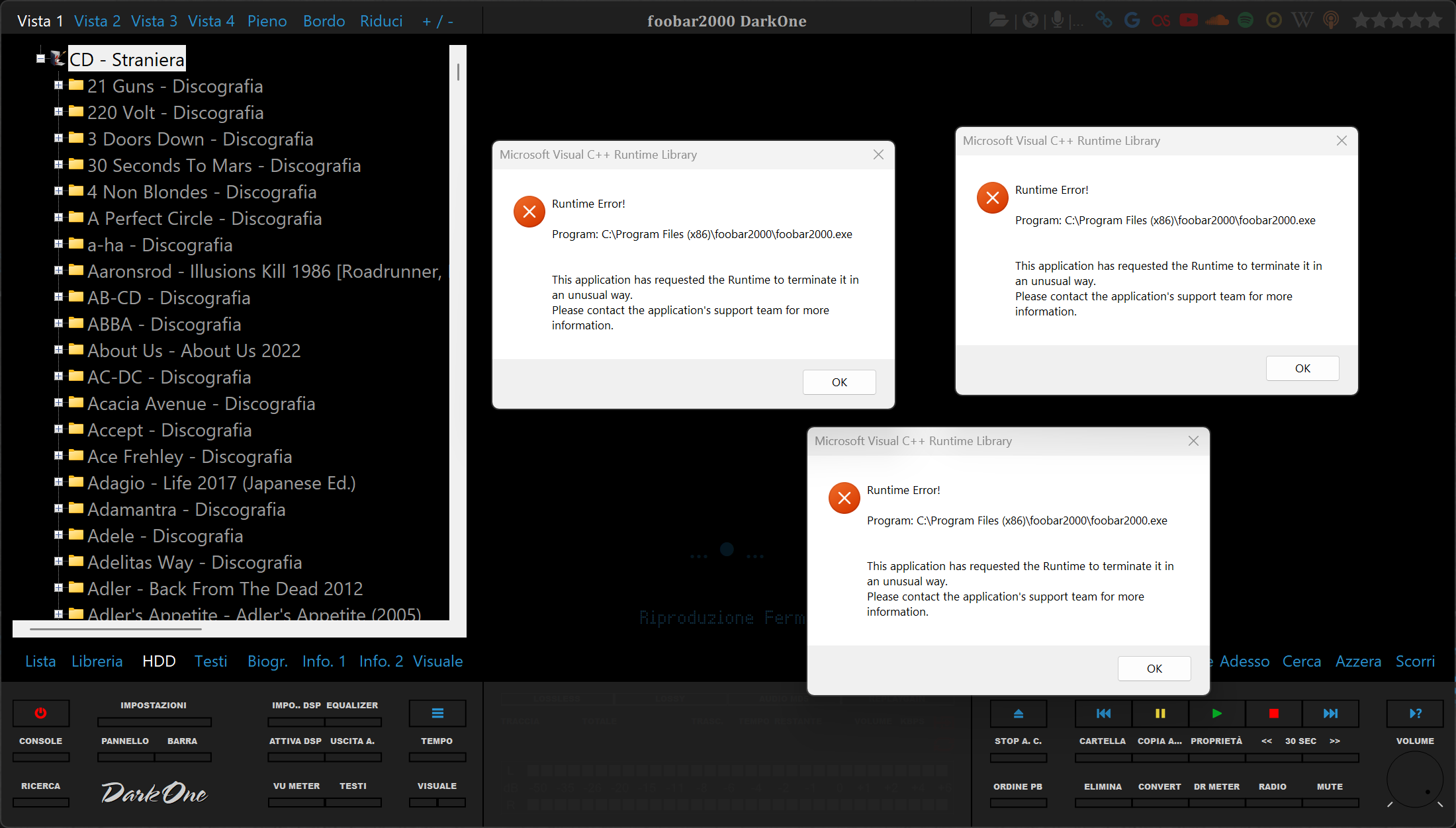 Если проигнорировать ошибку, foobar2000 продолжает работать. Но если подтвердить ошибку и закрыть окно, то foobar2000 тоже закрывается.