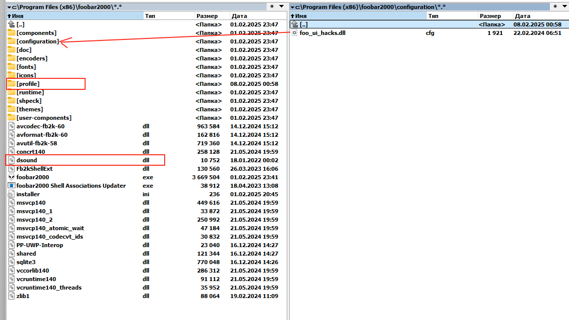 - 1) Разместить dsound.dll в корне папки установки foobar2000.dll (как раньше) и файл конфигурации UI Hacks тоже в папке конфиграции в корне (в старом стиле до появления папки profile):