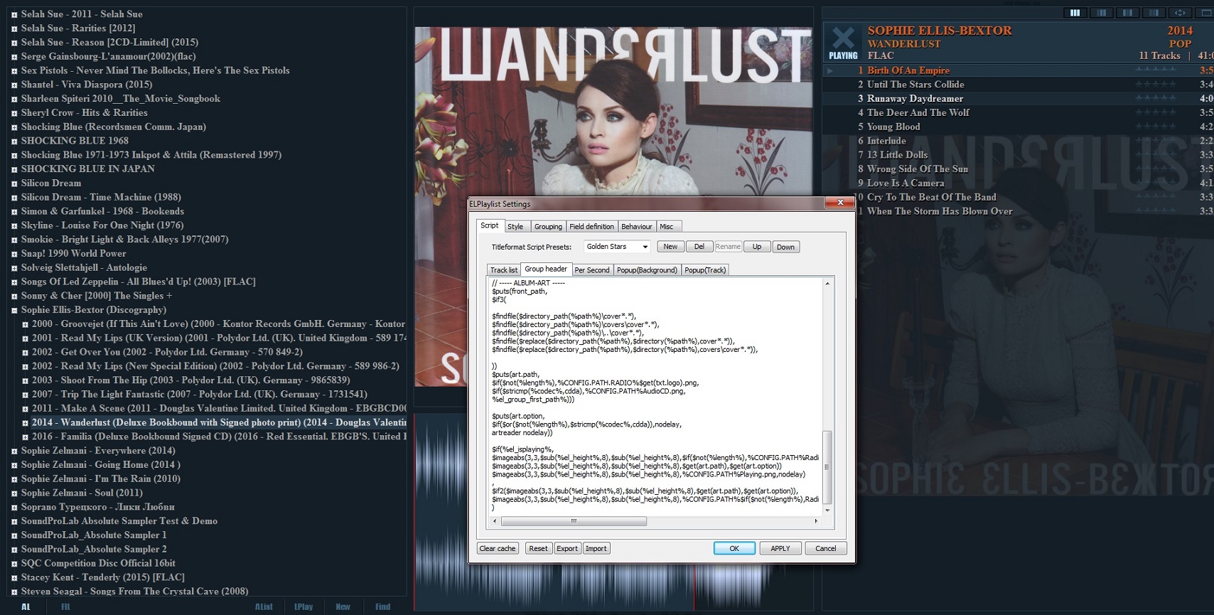 2. Для отображения обложек в панели Album Browser (панель EsPlaylist) необходимо зайти в Preferences - Tools - EsPlaylist, выделить поле %album artist% и нажав кнопку Edit убедится, что в графе Artwork установлен нужный тип обложки, которая будет отображаться для отрисовки сортировки по исполнителю. Возможен выбор из None, cover font, cover back, disc, artist, icon. Сама настройка поиска этих изображений находится в Preferences -> Display в соответствующих вкладках. Затем эти же действия повторить для %date% %album% %discnumber%. После всех изменений ПКМ по EsPlaylist -> Options -> Refresh.