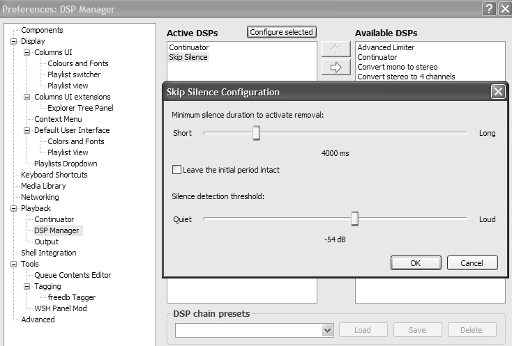 В dsp выставить первым - continuator, вторым - skip silence. Настроить эти плагины как скриншоте.