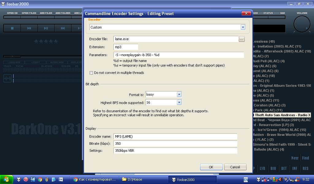 Это кодировка в VBR.Андрэй:Как с конвертировать MP3 битрейдом больше 320 ? С помощью кодировщика LAME это возможно ? И если да то какие настройки нужны.