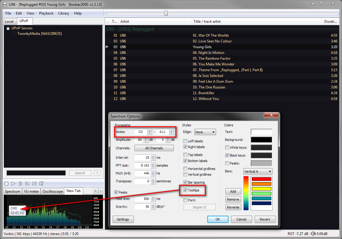 lerans, на скрине Вы видите примерный вариант настройки этого плагина. Если включена опция Tooltips, то при наведении на визуализаторе Вы увидите ноты и их значения. Так Вы сможете подобрать нужный интервал (меняется сверху в разделе Notes).