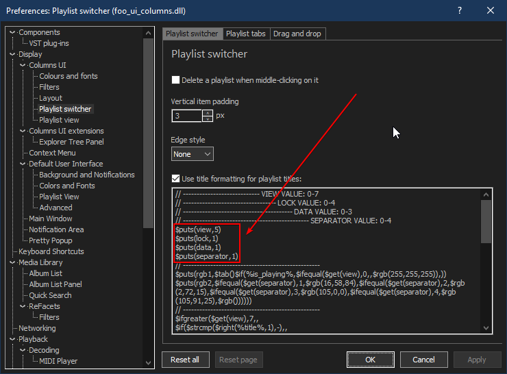 - В панели "Lists" можно выбрать различные виды отображения. Для выбора желаемого вида нужно зайти в настройки "Preferences\Display\Columns UI\Playlist switcher -> Use title formatting for playlist titles:" и поменять значения view, lock, data и separator.