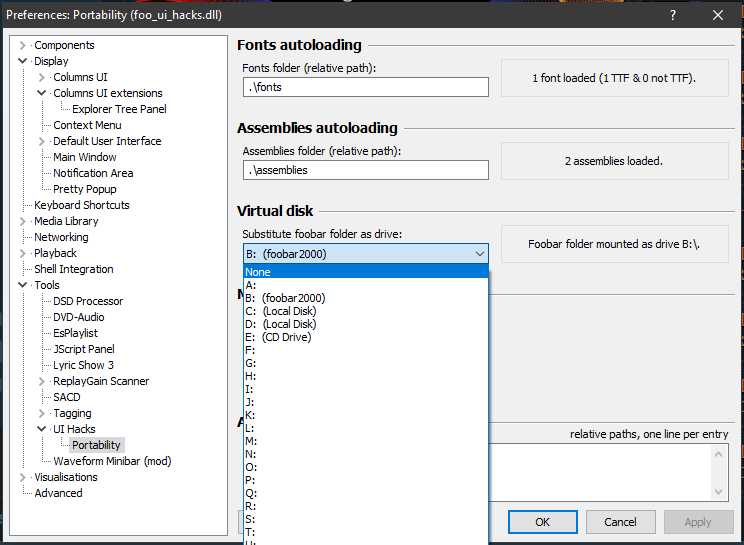 Это что за Б такое? Если разговор про foo_uie_explorer и foo_ui_hacks с виртуальным диском B, то у меня он в исключениях стоит, поэтому и не отображается