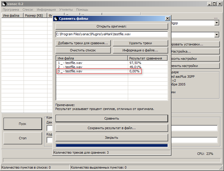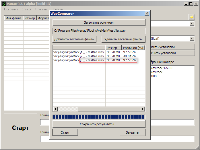 Скачал я vanac-x86-03113-preview.exe. Стал клацать, что она там умеет. Создал тестовый файлик testfile.wav в разделе vaMark. Провёл тест... бла-бла-бла. После я решил посмотреть как сильно отличаются полученные файлы (wav, ogg, mp3). Зашёл в WAV Comparer и получил такие результаты: