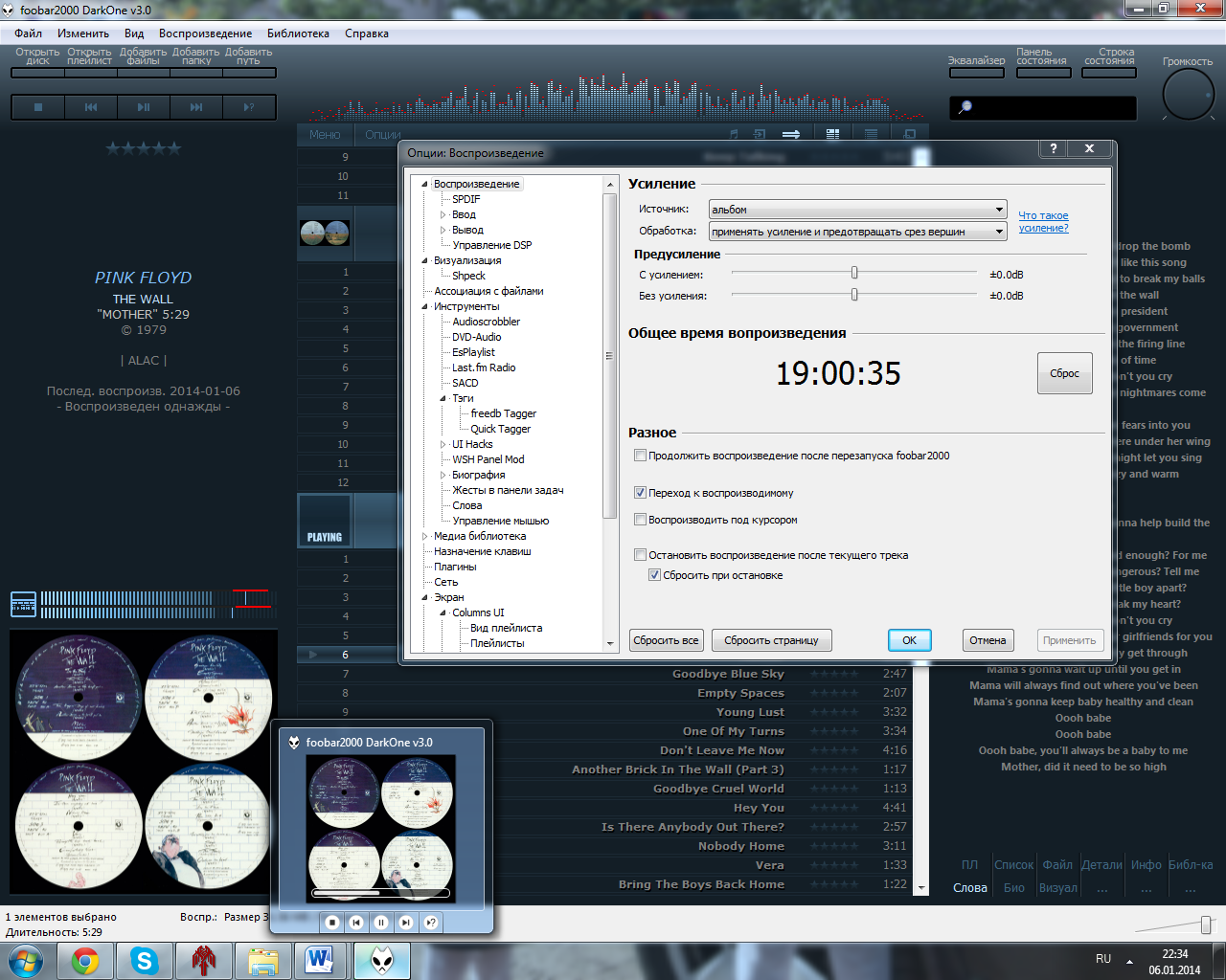 foobar2000 DarkOne v3.0 - всё было указано. Единственно добавляю - ос - стандартная лицензионная 7-ка.