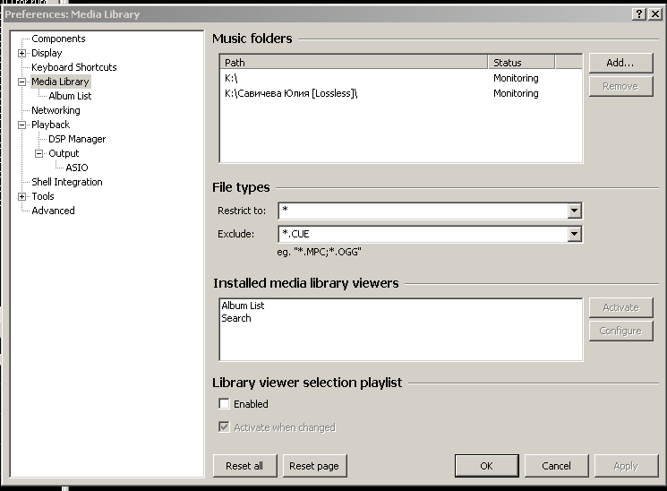 У меня вопрос. Есть диск К:\ на котором расположены папки (допустим Enigma и др.)в папке Enigma расположены папки, в которых находятся файлы касающиеся одного диска (CUE, FLAC, фото) В конфигурации библиотеки следующее см.рис. В библиотеке есть папки в которых выделены треки, есть папки один общий трек в который слиты треки этого диска, нет папок см.рис. А это CUE из папки, которой вообще нет в библиотеке