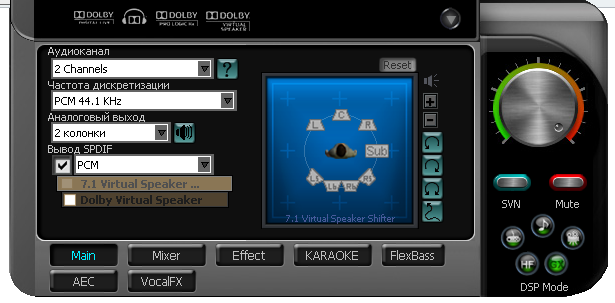 А что правильного в желании выбирать многоканальный выход, имея физически двухканальный стереотракт ?rrn:Хотелось бы видеть в привычной форме: возможность выбора конфигурации (2.0, 2.1, 5.1 и т.д.), выставить расстояние до каждой АС......или я неправильно что-то делаю