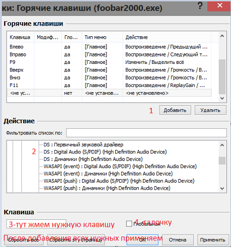 выберите устройство вывода DirectSound, WASAPI или ASIO.