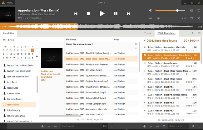 Вообще какая-то странная ситуация складывается с программами для проигрывания музыки - или прекращается разработка (Apollo) или они обрастают всякими медиатеками, улучшайзерами и прочим барахлом (Winamp, AIMP). foobar2000 пока самый приятный, но требует "допиливания", что тоже не всегда хорошо.