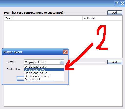 А) Event list - Add - Add player event - On playback stop - End-of-file signal