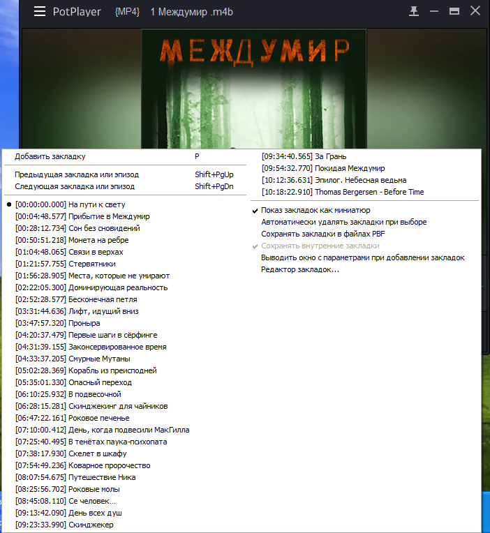 Имеется один m4b-файл, разбитый на главы. И вот как видит их Potplayer (т.е. без проблем показывает и продолжительность глав и их названия)