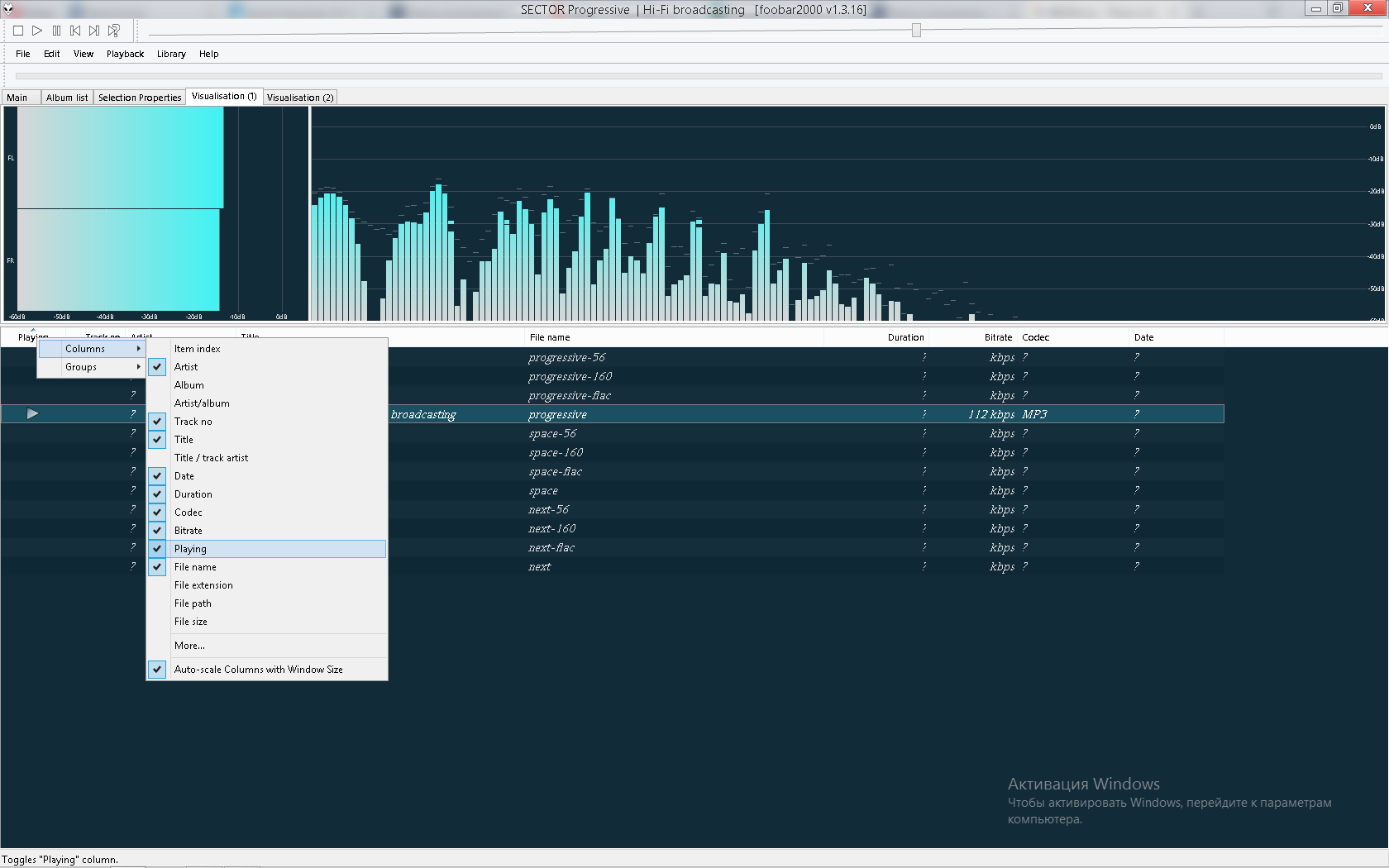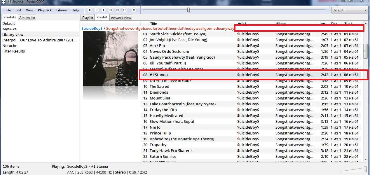 Приветствую! Знаю только как выставить стрелочку - указатель напротив играющего трека( как я заметил у Вас он не выставлена).Над альбомом строка информации клацаете правой кнопкой и в менюшке Columns нужно выставить галочку напротив Playing))))