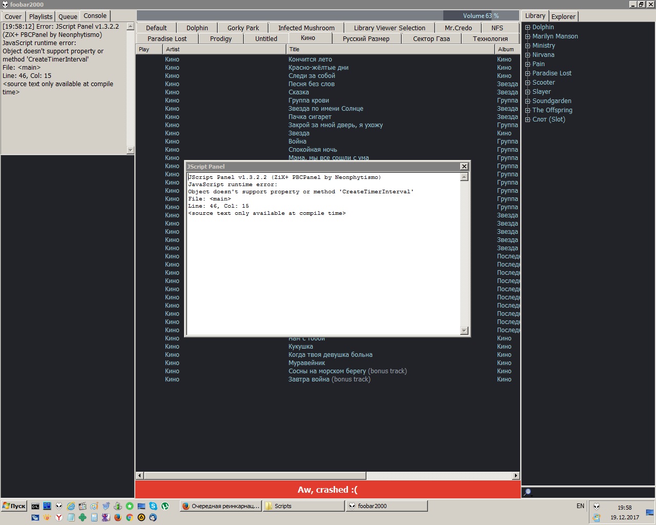 macarych, JScript Panel v1.2.0 у меня сейчас установлен русифицированный типа. Хотя вы правы - 1.3.2.2 пробовал тоже. В любом случае скрипт дает сбой. А не могли бы вы поделиться данной версией JScript?