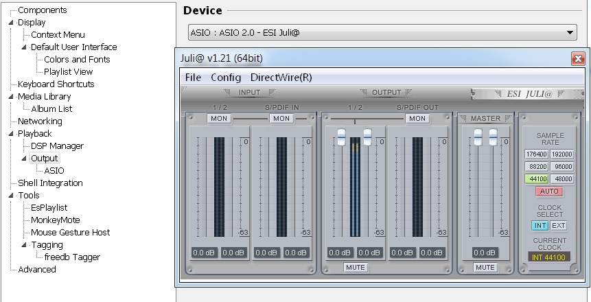 vladj:Что касается ASIO...плагин не забыл установить в компоненты для такого вывода (foo_out_asio.fb2k-component) ? Вроде как джульки железно поддерживают ASIO