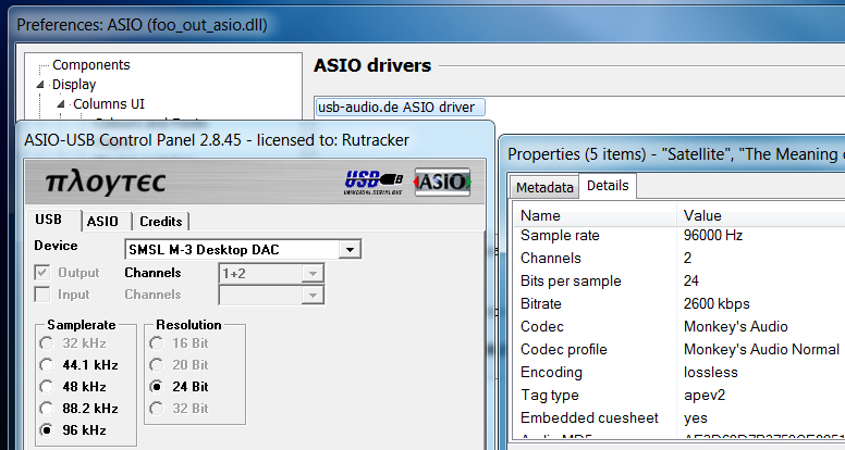 Ну а после установки драйверов к цапу в фубаре появляется вывод настоящего, аппаратного ASIO. В данном случае цап автоматом переключился на 96 проиндицировав это светодиодом. Формат 192 цапом не поддерживается в виду его относительно небольшой стоимости (около 5 тыр), но меня это не парит т.к. разницу между 192 и 96 я все-равно не слышу...между 48 и 96 уже слышу разницу. Подтверждение работы настоящего, аппаратного ASIO...