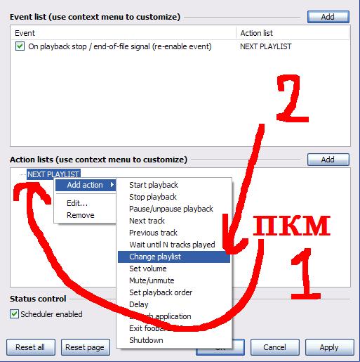 Г) В том же окне - ПКМ на CHANGE PLAYLISTS - Next playlist - либо укажите на другой плейлист, который захотите проиграть после предидущего - ОК