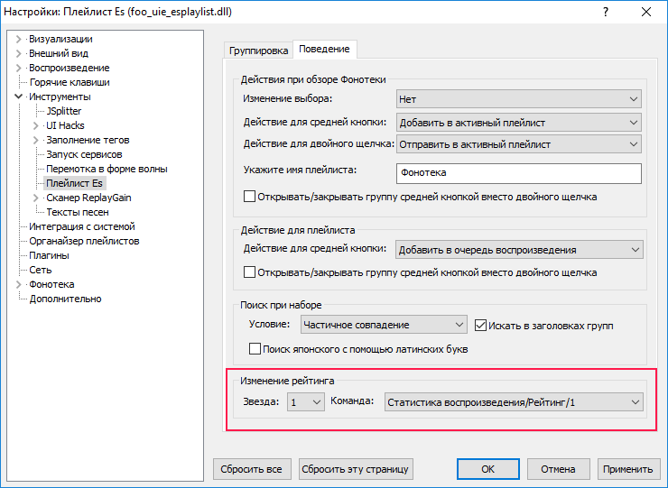Вся путаница в том, что в настройках столбца Es плейлиста указано, что следует брать информацию из тега RATING. Если не установлен foo_playcount, то он действительно берет и отображает из тега, но не дает его изменить двойным щелчком по звездочкам, только вручную меняешь в свойствах трека поле <RATING>. Но если установлен foo_playcount, то он берез рейтинг из его базы и дает изменять рейтинг на месте, у него даже в настройках это есть: