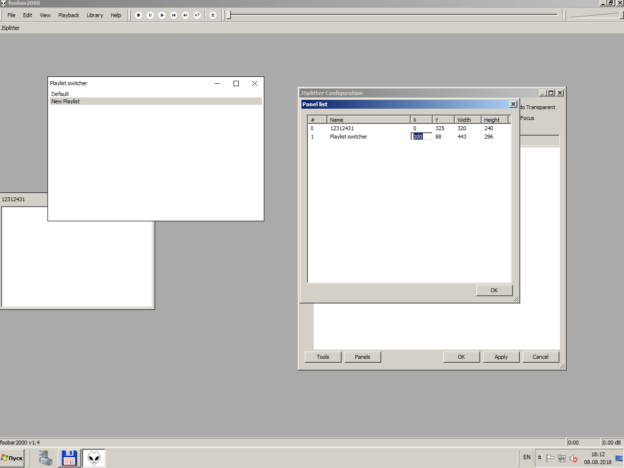 1. Foobar 2000 v.1.4, JSplitter v.2.1.6.1 в окне настроек Panel list данного плагина при попытке изменения размеров данного окна кнопка ОК пропадает. Думаю стоит либо устранить этот эффект, либо убрать вообще возможность менять размеры окошка.