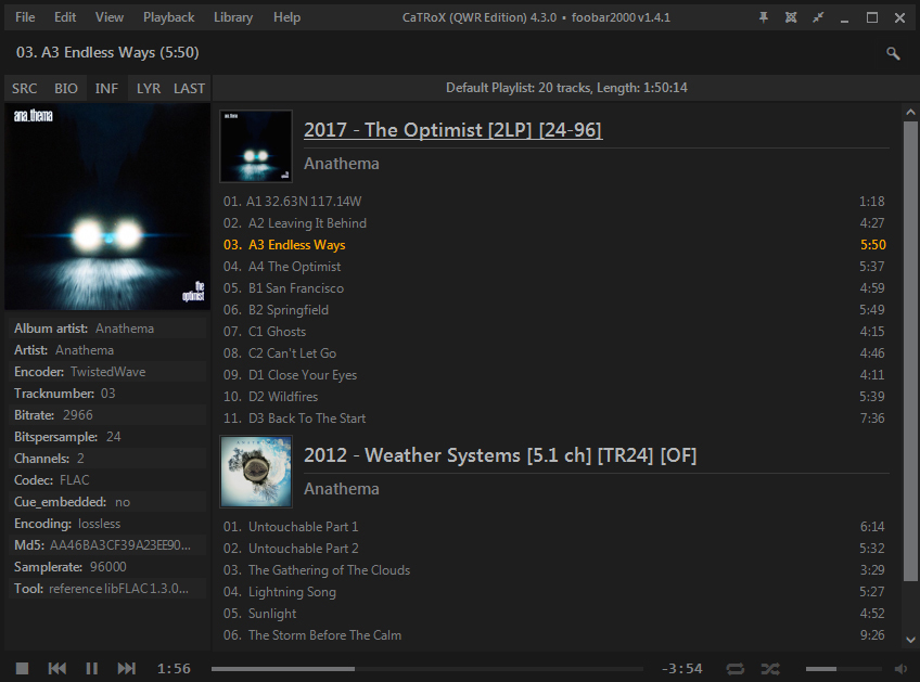 Накатил на официальный foobar v1.4.1 тему CaTRoX (QWR Edition)