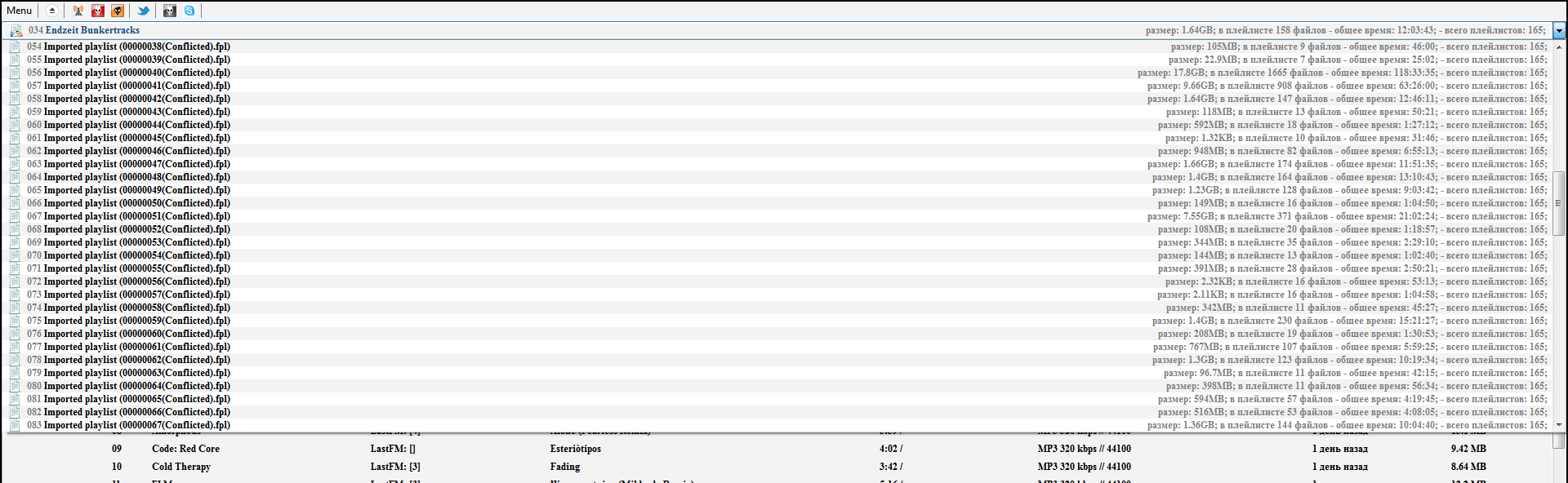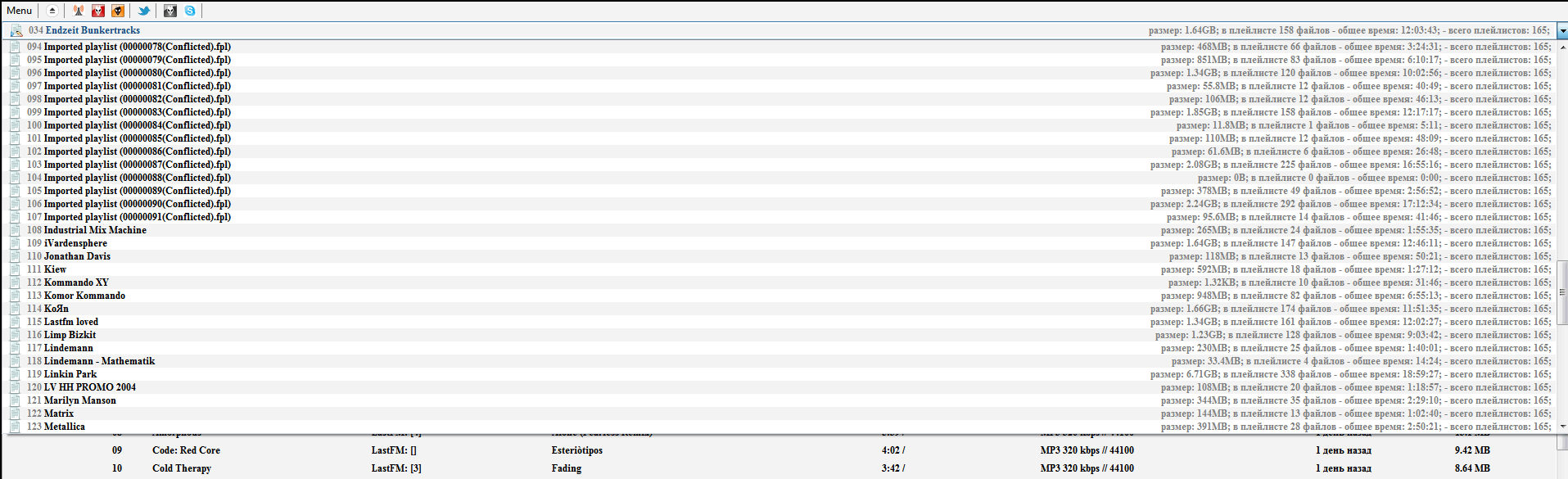 спасибо, теперь научен. Интересно, конечно, что так повлияло на плейлисты. За все время использования Foobar впервые выдал мне такоеNikolaich:в папке со списком плейлистов лежит филе "index.dat" - из него можно попытаться восстановить имена плейлистов,