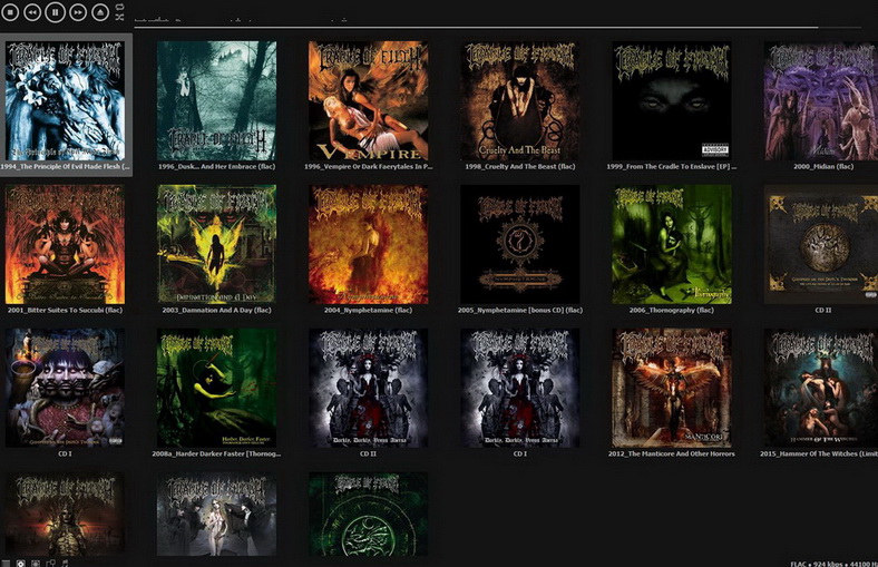 1) "Плоский" режим с фоновой обложкой - это просто список треков с разделением по альбомам или по папкам (если прилетели из Проводника)