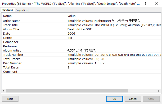 %album artist% :: %album% :: %date% [:: CD %discnumber%]Теги грамотно прописаны. И номера треков заполняю автоматически, но на всякий случай проверил - с ними тоже всё в порядке. Сейчас пришла мысль, что это из-за имени исполнителя: эти два трека, выбивающиеся вверх - от исполнителя, имя которого пишется латиницей (просто я его в общее поле ALBUM ARTIST не стал запихивать), а два остальных исполнителя написаны иероглифамиMC Web:Наличие лишних пробелов и прочего может на все это влиять