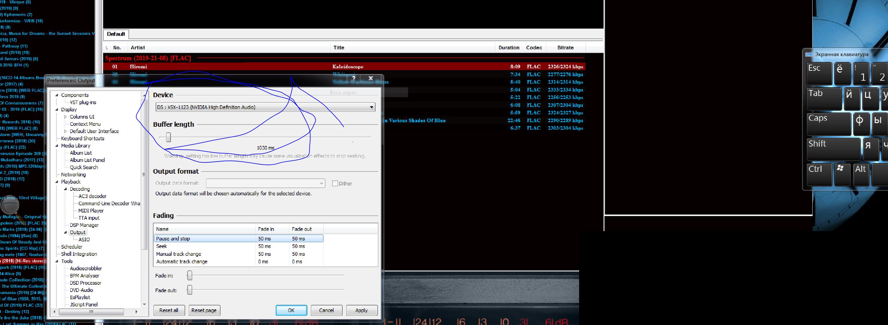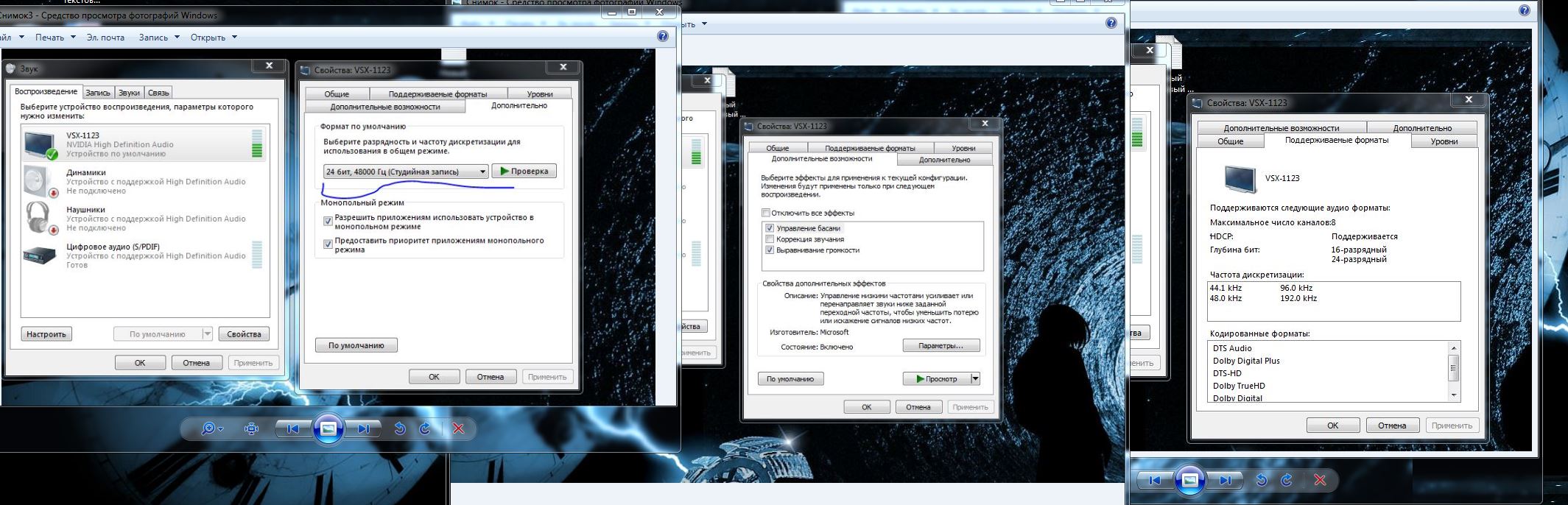 Ага, со скринами уже понятней. Вот смотри... при выводе по wasapi то, что у тебя подчёркнуто (24/48000) роли совершенно не играет, т.к. ниже стоят галочки на монопольном режиме. При нормальных настройках даже если там 16/44100, на ресивер спокойно пройдёт стерео 24/192000. В монопольном режиме эта часть микшера обойдётся стороной. Смотрим на скрине правей... очень грубая ошибка что не поставлена галочка на отключение эффектов. С тембром, подгоняя под комнату звучание, работай только на ресивере.epic721:А, как-то поподробнее можно